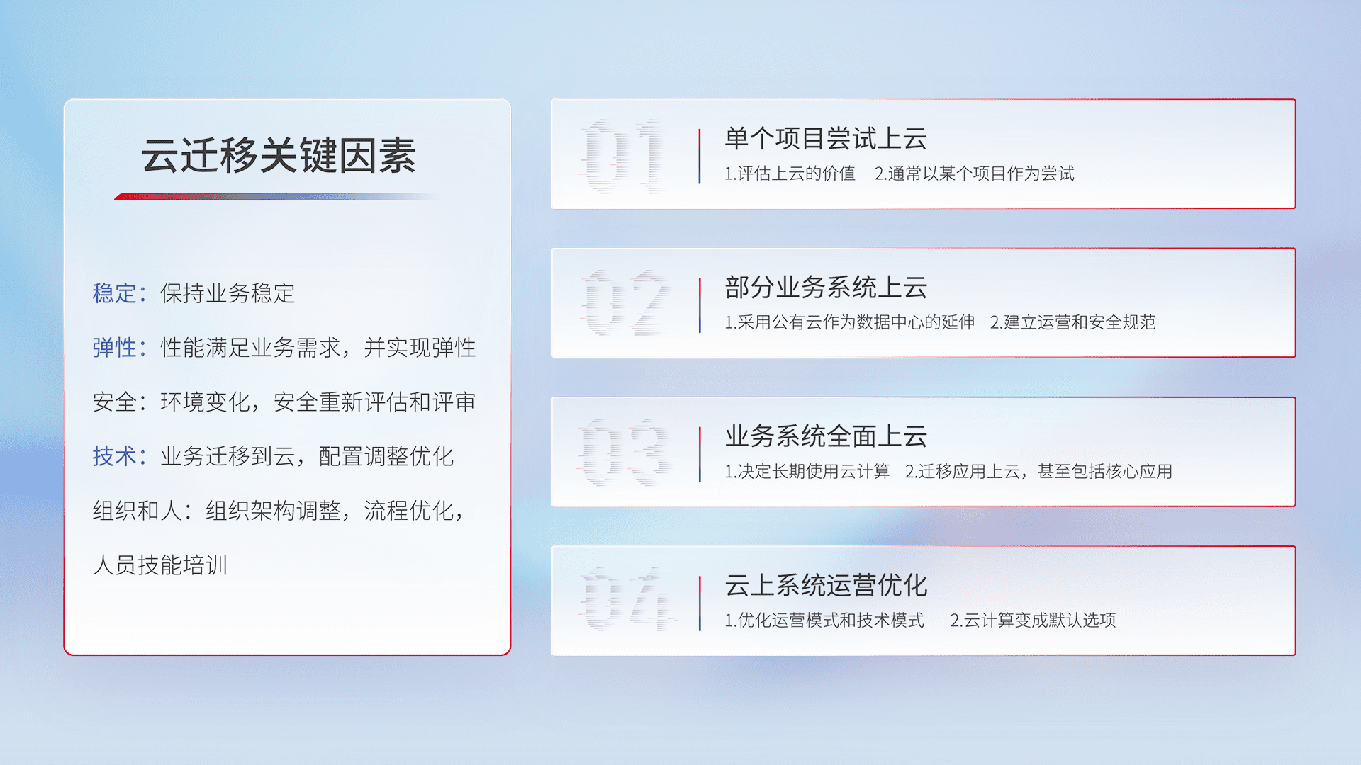 结合实际业务,,从规划设计、、、云平台选型、、、云原生改造、、、数据迁移、、集成交付,,,迁移全过程为客户识别最佳上云路径,,做好风险识别管理,,,设计网络架构、、、、身份权限、、、安全审计合规、、、操作审计、、日志审计、、、、监控告警策略、、、、多站点容灾设计等,,,对云上基础设施进行整体规划,,,,提升IT治理水平,,,,以满足弹性、、、高可用、、、高性能的需求。。