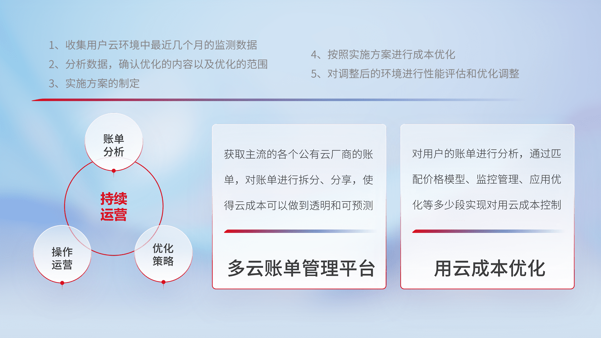 通过多云纳管,,,以统一的资源数据模型把客户的云资源进行抽象和封装,,,,进而实现对多云资源的统一操作,,,保障云资源管理的可靠性、、、、稳定性与可用性。。。量身定制化运维内容,,,配置、、、、开发运维、、、补丁管理、、、备份、、监控、、、、认证和访问管理、、审计和日常巡检等,,,,保障在用云过程中的可靠度,,稳定度以及高可用率。。