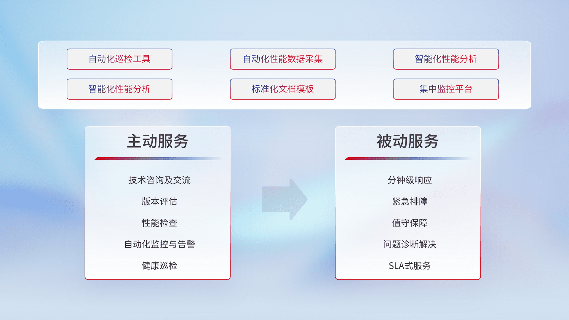 智能化工具和标准化文档,,,保障服务质量,,提供主动服务(包含技术咨询、、版本评估、、性能检查、、、自动化监控与告警、、、健康巡检)和被动服务包含(分钟级响应、、、紧急排障、、、、值守保障、、问题诊断解决、、、SLA服务)。。